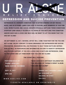 This Saturday, September 16, 2017, several Artist(s) will come together for the “You Are Not Alone“: Relief Concert to raise awareness for Depression and Suicide Prevention. Resources will be provided to help those battling Depression as well as resources and information on how to identify Depression and provide support. If you or a loved one is battling depression, come to this event and let them know that they’re not alone! The Event will be starting at 8 PM until 1 AM. There will be Performances by Arok Hill,G079MAN, and many more talented Artist(s) and will also be an Album Release Party for the release of THE860‘s debut album, “You Are Not Alone“ The very talented Glace Azuka will be DJing. Tickets for this Event are $10 and you can purchase your tickets here. Everyone come on out and help support this great Cause for Depression and Suicide Prevention Awareness and enjoy the show!!! We hope to see you there!!!